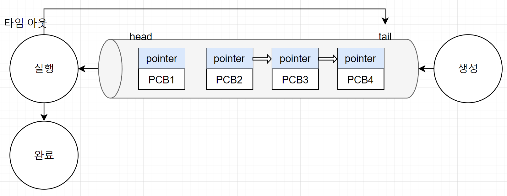 - 대기 중인 작업들이 순서대로 돌아가면서 처리된다. 각 작업이 한 번씩 실행된 후 다음 작업으로 넘어가며, 마지막 작업이 끝나면 처음 작업으로 돌아온다.