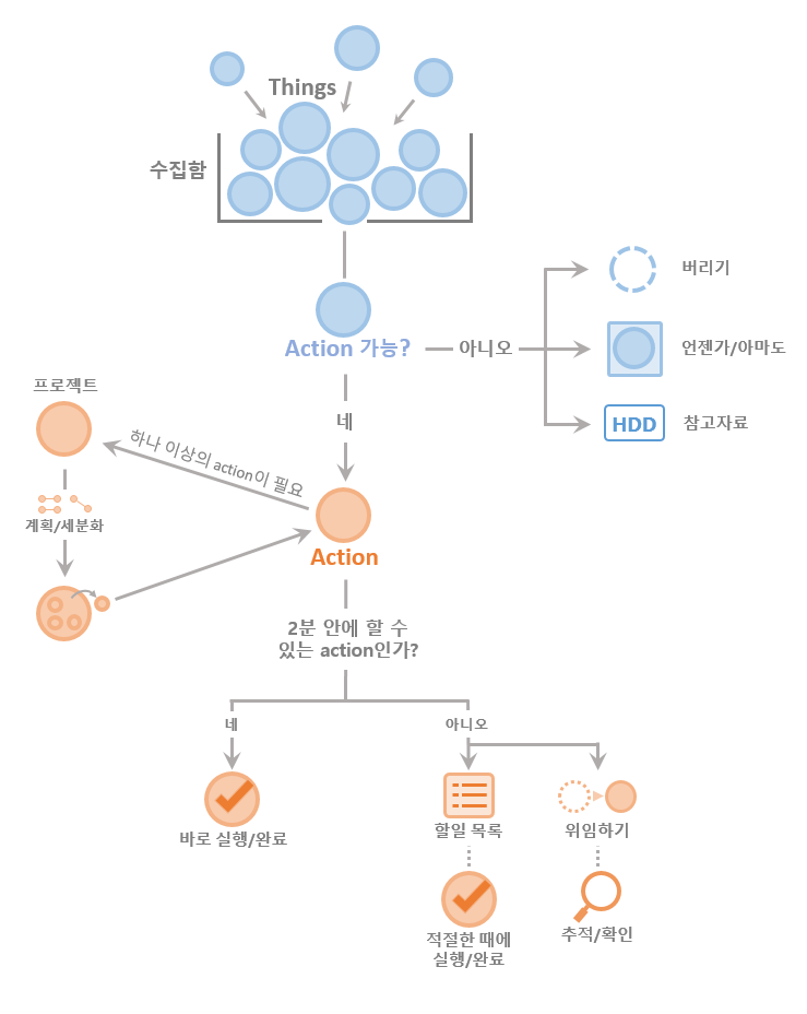• Actions로 변환이 안되는 Things는 버리거나 Somedays에 넣어두고 검토 때 Actions으로 바꾸거나 버린다.