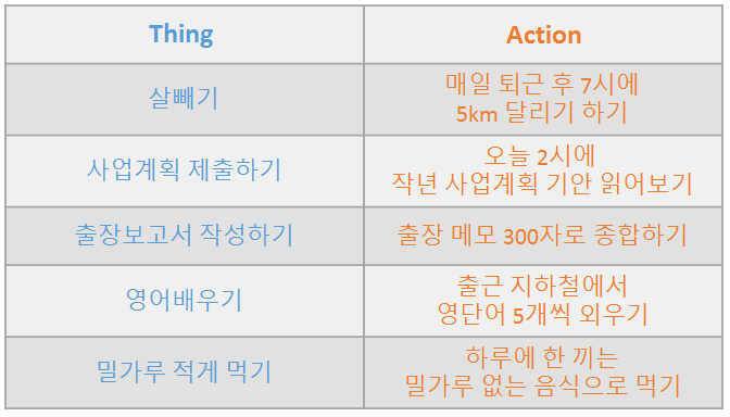 • Things를 Actions을 만드는 방법은 ‘나는 ~시간 안에 ~장소에서 ~을 한다.‘라는 문장으로 바꿔보면 된다.