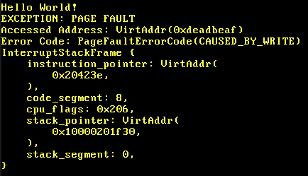 // in src/main.rs#[no_mangle]pub extern "C" fn _start() -> ! { println!("Hello World{}", "!"); blog_os::init(); // new let ptr = 0xdeadbeaf as *mut u8; unsafe { *ptr = 42; } // as before #[cfg(test)] test_main(); println!("It did not crash!"); blog_os::hlt_loop();}