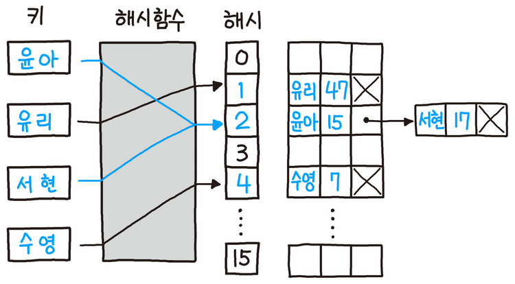 - 해시 충돌이 발생하면 해당 버킷을 연결 리스트로 구성하여 여러 값을 같은 버킷에 저장할 수 있도록 한다.