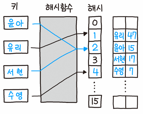 - 해시 테이블의 인덱스는 버킷이라고 한다.