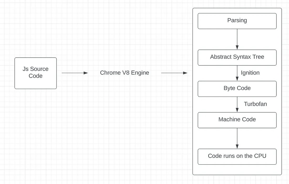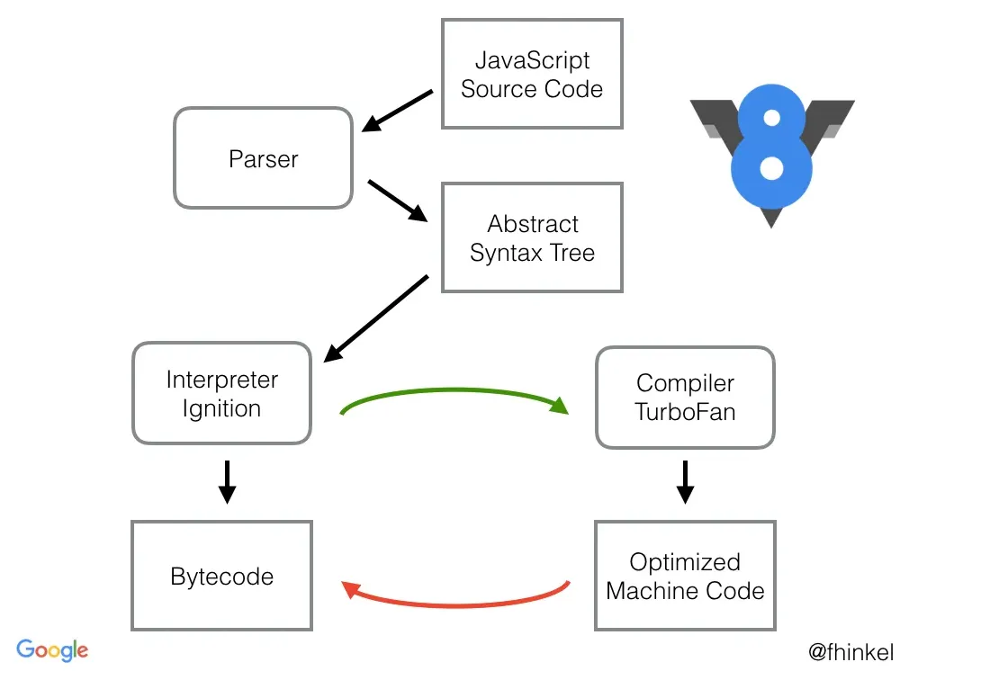 v8 엔진은 크롬 브라우저에서 돌아가는 JavaScript엔진으로 “소스코드 - 파싱 - AST - Ignition로 바이트 코드 생성 - 실행 - Turbo Pan 최적화” 순서로 동작된다.