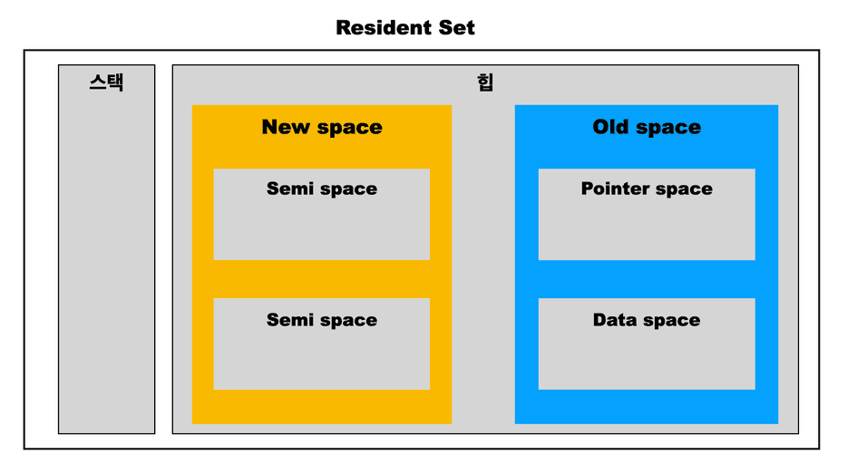 v8에서 프로그램이 실행되면 메모리의 Resident Set이라는 빈 공간이 할당된다. 스택 영역과 힙 영역으로 나눌 수 있다. (자바스크립트는 싱글 쓰레드라고 하나의 스택 메모리를 가진다.)