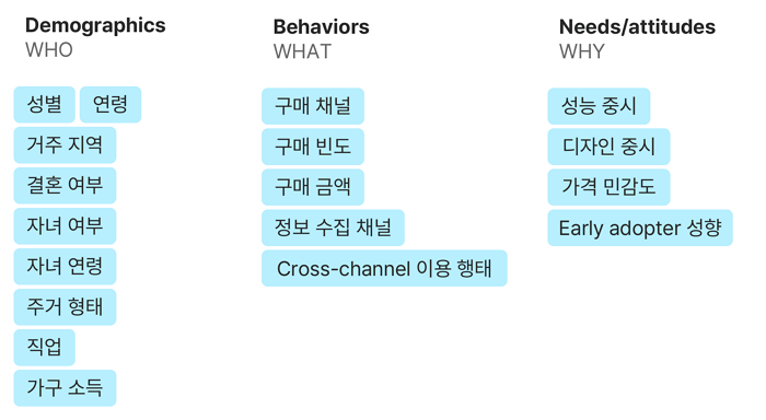 시장 세분화에서 활용할 수 있는 기준은 크게 3가지 유형으로 분류 할 수 있다.