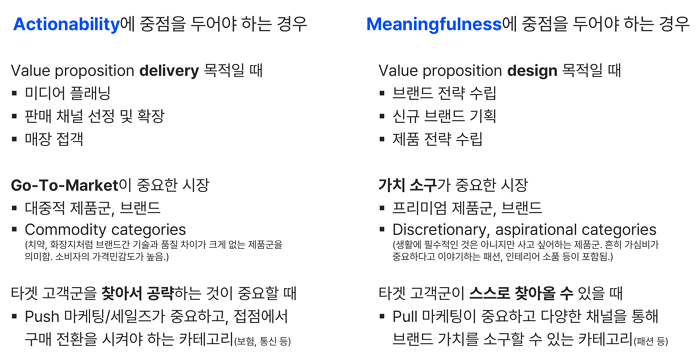 - 전략 수립 및 공유: 우선 순위화 과정에서 선정된 세분 시장에서 성공하기 위해 필요한 전략과 액션을 디자인하는 과정이다.